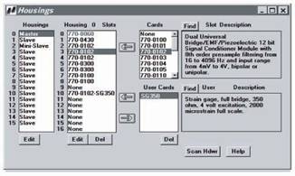 系统配置由电脑屏幕机箱完成(图3)。这里显示了系统用的机箱数量和类型, 标准机箱或微型机箱都能选择成主机箱或从机箱。 在每个机箱中,采集卡被选择和分配一个插槽,其可以从一个标准系列卡列表中选定,也可从已预先编程,为特定的传感器和应用而设的用户卡列表中选取。