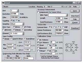 插入机箱槽的卡是通过特定的卡配置屏幕来编程设置的。图4显示建立二通道通用信号调理卡情况。在这个屏幕上,使用者可选择端口,建立激励电压,予置采样滤波器,增益及偏置。